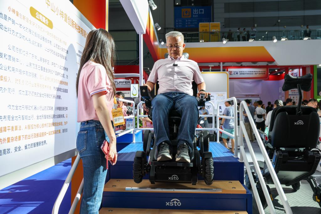 9月12日,觀眾在國際智慧養老產業博覽會現場體驗智能出行機器人。新華社記者 梁旭 攝